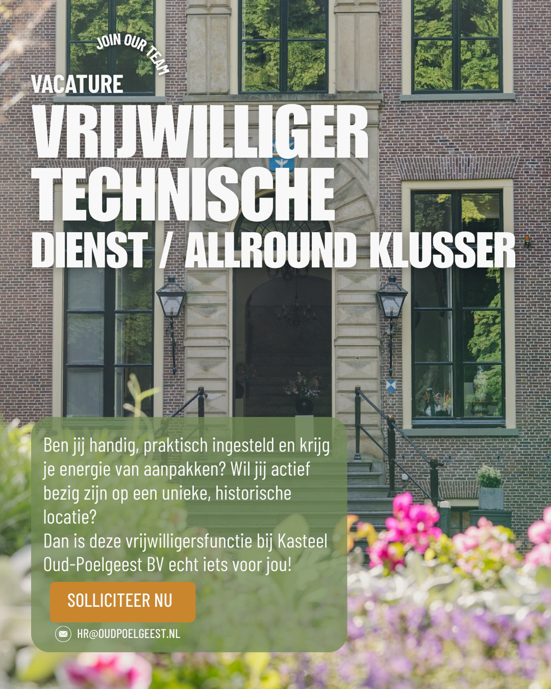 Als vrijwilliger ondersteun je onze Technische Dienst bij onderhoud, klussen en het ondersteunen van evenementen op een unieke, historische locatie. Geen dag is hetzelfde en jouw inzet maakt écht verschil.